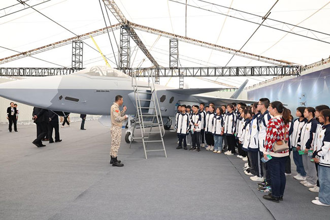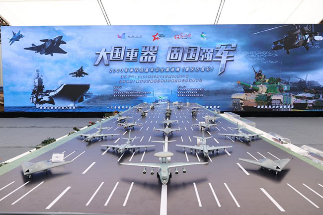 輝煌歷程展區(qū)以時間主線,將我國軍事科技領(lǐng)域的重要任務(wù)和重大事件,形成時空長廊,再現(xiàn)“大閱兵”的恢宏場景;陸戰(zhàn)驕子展區(qū)則是展示陸軍現(xiàn)代化建設(shè)成果的重要展區(qū),各型1:1比例的裝備模型,讓人們深刻體會到中國陸軍裝備的壯大;劍指深藍(lán)展區(qū)聚焦海軍強(qiáng)大艦艇裝備,各型號軍艦和先進(jìn)武器系統(tǒng)的展示讓人們感受到海軍走向深藍(lán)的勇氣;藍(lán)天利刃展區(qū)則展示空軍先進(jìn)武器和戰(zhàn)機(jī),各型號戰(zhàn)機(jī)和導(dǎo)彈的專業(yè)介紹讓人們體驗(yàn)到空軍的迅猛發(fā)展;鳴嘯長空展區(qū)則是以“兩彈一星”為主力展品,并結(jié)合導(dǎo)彈發(fā)射車、空天一體打擊體系等內(nèi)容,展示我國戰(zhàn)略打擊力量;深空探秘展區(qū)則是展示我國太空事業(yè)發(fā)展成果的重要展區(qū),各類衛(wèi)星、火箭、空間站的展示,讓人們感受到中國太空事業(yè)的高速發(fā)展。