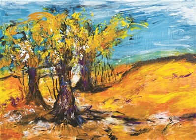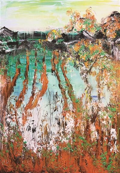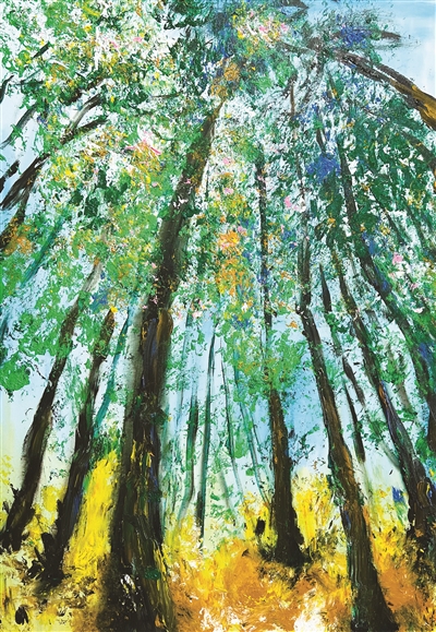 吳冠中老先生曾說,中國畫不能“近親結(jié)婚”。因為我們的視野狹窄。藝術(shù)是相通的,不分東方和西方。因此,劉家男不斷吸收東西方精華,并運用于作品之中。她的作品既能呈現(xiàn)出西方作品的色彩美感,同時又兼具中國潑墨的畫面呈現(xiàn)。無論是胡楊林系列,還是天端系列、鯨落系列以及自然系列,其作品的整體色彩都是非常大膽的,給人以強烈的視覺沖擊。劉家男認為,這是一個藝術(shù)家應有的標志性符號。