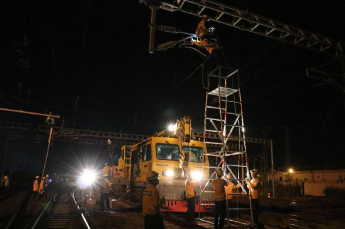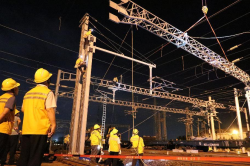 ??谡臼沁B接環(huán)島高鐵東西段、西環(huán)貨線和過(guò)海列車的樞紐車站,日常維修天窗時(shí)間只有60-120分鐘,施工天窗也在180分鐘內(nèi),對(duì)于更換跨越7條承導(dǎo)線索的硬橫梁是個(gè)不小的挑戰(zhàn),該段周密部署,從9月15日就進(jìn)入了緊張的更換??谡居矙M梁的過(guò)渡施工天窗作業(yè)中。