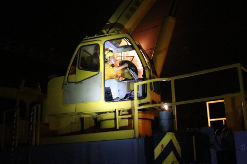 2022年9月22日凌晨0點(diǎn)33分,一聲“開(kāi)工作業(yè)”嘹亮的口號(hào)劃破了??诩澎o的夜空,作業(yè)人員根據(jù)分工有條不絮的開(kāi)始忙碌起來(lái)。1點(diǎn)35分隨著吊車吊臂平穩(wěn)落下,一組長(zhǎng)23.03米的橫梁穩(wěn)穩(wěn)的落在鋼柱上,作業(yè)人員迅速對(duì)位、連接、緊固、落臂……熟練的操作一氣呵成,順利精準(zhǔn)完成了海南環(huán)島高鐵首次硬橫梁更換作業(yè)。