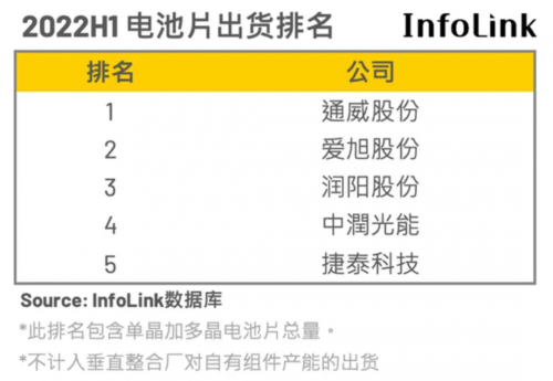 據(jù)PVInfoLink統(tǒng)計(jì),今年上半年晶硅電池總產(chǎn)量約135.5GW。TOP5的通威股份、愛(ài)旭股份、潤(rùn)陽(yáng)股份、中潤(rùn)光能、捷泰科技,總出貨量約59GW,占43.54%。另有投研機(jī)構(gòu)統(tǒng)計(jì),TOP5出貨中,通威出貨約為22.5GW、愛(ài)旭出貨約為17GW、潤(rùn)陽(yáng)出貨約為13GW、中宇出貨約為5GW,捷泰出貨約為3GW。