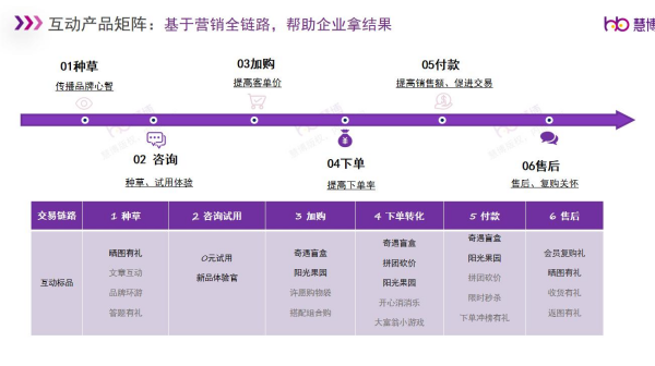同時(shí),慧博「雪鸮」的互動(dòng)營(yíng)銷產(chǎn)品是基于用戶營(yíng)銷全鏈路,從種草、咨詢、加購、下單、付款、售后整個(gè)閉環(huán)流程,最大程度的完成用戶價(jià)值轉(zhuǎn)化,提升用戶忠誠度。