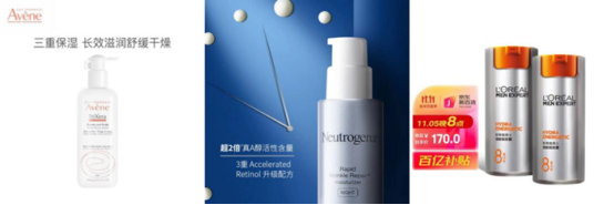 雅漾三重修護(hù)盈潤(rùn)乳、露得清維A醇抗皺修護(hù)晚霜、歐萊雅勁能醒膚露