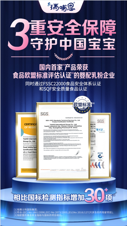 秉承“消費(fèi)者第一第一第一”的企業(yè)價(jià)值觀,蒙牛瑞哺恩對標(biāo)全球最嚴(yán)標(biāo)準(zhǔn),全面啟動歐盟標(biāo)準(zhǔn)升級,憑借著高標(biāo)準(zhǔn)、嚴(yán)要求,瑞哺恩國內(nèi)4家工廠均順利拿下國際權(quán)威認(rèn)證機(jī)構(gòu)SGS授予的歐盟食品標(biāo)準(zhǔn)認(rèn)證,蒙牛瑞哺恩更成為國內(nèi)首款通過食品歐盟標(biāo)準(zhǔn)評估認(rèn)證的嬰配乳粉產(chǎn)品,同時(shí)還獲得SGS授予的FSSC2200食品安全體系認(rèn)證和SQF食品安全質(zhì)量認(rèn)證,代表著蒙牛瑞哺恩旗下的嬰幼兒配方奶粉的生產(chǎn)已達(dá)到國際一流水平。