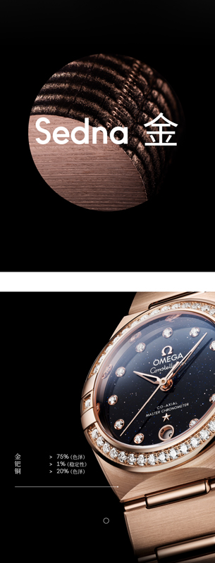 歐米茄研發(fā)的Sedna 18K金由金、銅和鈀三種金屬熔合而成,名字源于太陽系中表面顏色最紅的Sedna小行星,銅的巧妙比例讓Sedna金色澤更柔和雅致,稀有金屬鈀則讓微紅的色澤更加穩(wěn)定,歲月更迭間盡顯華貴雅致風范。