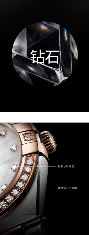 鉆石源自天地自然,晶瑩華美。歐米茄只甄選凈度從無瑕到VVS級別的“Top Wesselton”白色鉆石,經(jīng)高水準的專業(yè)切割工藝和精妙設(shè)計,或鑲于表圈,或嵌在表盤,以璀璨光芒詮釋永恒之美。