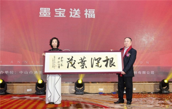值此交接時(shí)刻,伍倩雯向第四屆會(huì)長藍(lán)漢昌贈(zèng)出名家墨寶《根深葉茂》,向藍(lán)會(huì)長八年來的無私奉獻(xiàn)、為酒協(xié)發(fā)展打下的深厚基礎(chǔ)致以深深的敬意和祝福。