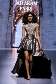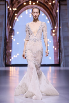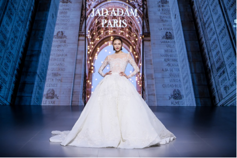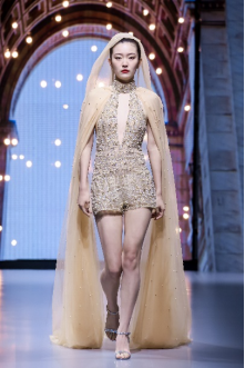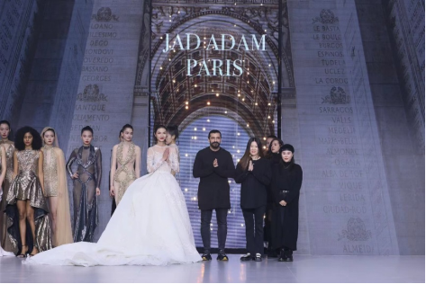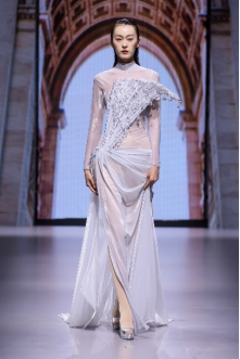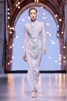 在充滿異域風(fēng)情的“巴爾米拉女王”主題發(fā)布中,法國高定女裝設(shè)計師JadAdam攜手紹興永耀紡織品有限公司、紹興晶遠(yuǎn)創(chuàng)意設(shè)計有限公司展現(xiàn)了尋找內(nèi)心平靜的啟蒙之旅的獨(dú)特過程。設(shè)計師從柯橋優(yōu)秀的面料中獲得啟發(fā),在華麗的禮服裙中采用了大量的刺繡及繡片繡珠工藝。兩家企業(yè)提供的閃光高密度歐根紗、銀色金屬絲、清透網(wǎng)眼等面料,花型立體簡潔、色彩透亮多變,為設(shè)計師帶來了豐富的靈感。從晚禮服、婚紗到高級時裝,JadAdam通過特有的藝術(shù)表現(xiàn)手法詮釋了本次禮服設(shè)計。