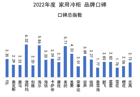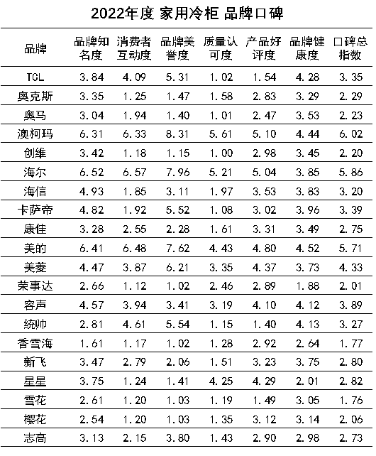 口碑總指數(shù)方面,與上期相比,新入榜品牌有TCL、創(chuàng)維;落榜品牌有惠康、晶弘。澳柯瑪、海爾、美的在口碑總指數(shù)中位居前三。澳柯瑪、海爾、美的、美菱、容聲、卡薩帝、統(tǒng)帥、海信、星星在近兩期中表現(xiàn)穩(wěn)定,口碑總指數(shù)位居前十。TCL在本期口碑總指數(shù)中有強(qiáng)勁表現(xiàn),晉升至前十,新飛則在本期口碑總指數(shù)中掉出前十。
