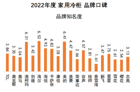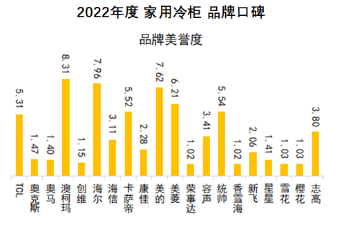 品牌美譽(yù)度方面,澳柯瑪、海爾、美的位居前三。澳柯瑪、海爾、美的、美菱、統(tǒng)帥、卡薩帝、容聲、海信在近兩期中均位居前十。TCL、志高在本期晉升至前十,星星、新飛則掉出前十。