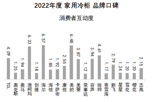 消費(fèi)者互動(dòng)度方面,海爾、美的、澳柯瑪位居前三。海爾、美的、澳柯瑪、統(tǒng)帥、容聲、美菱、新飛、康佳在近兩期中均位居前十。TCL、志高在本期晉升至前十,卡薩帝、奧馬則掉出前十。