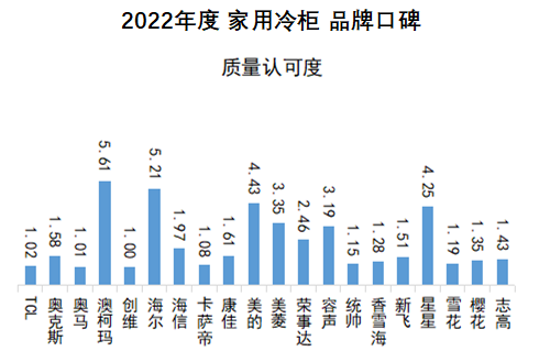 質(zhì)量認(rèn)可度方面,澳柯瑪、海爾、美的位居前三。澳柯瑪、海爾、美的、星星、美菱、容聲、榮事達(dá)、海信、康佳、奧克斯在近兩期中均位居前十。