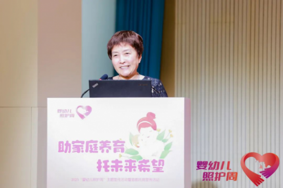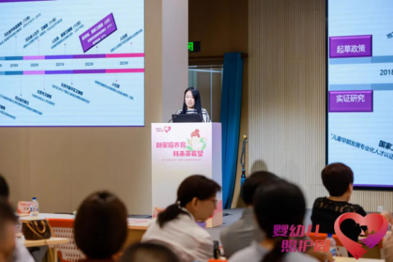 ▲國家衛(wèi)生健康委婦幼健康司副司長沈海屏做《兒童早期發(fā)展與嬰幼兒養(yǎng)育照護》主旨報告