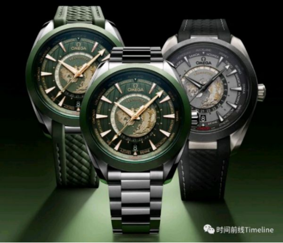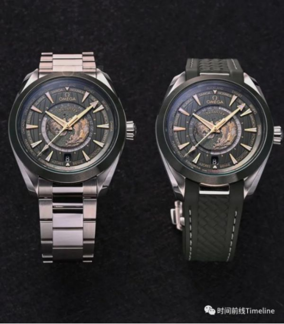 這款世界時的細節(jié)在于,內(nèi)表盤的海洋顏色與手表配色一致,鈦殼是灰色、鋼殼是綠色;陸地則采用激光技術(shù)進行著色,金色是高海拔地區(qū)。其中鈦金屬表盤的黑灰色都是由激光歐米茄的地圖是以北極為中心的北半球,我們可以注意到,地圖帶有微微的弧形效果,模仿了真實的地球曲率。盤面上帶地圖的表不少,但像歐米茄做的這么細致真實的,極少。