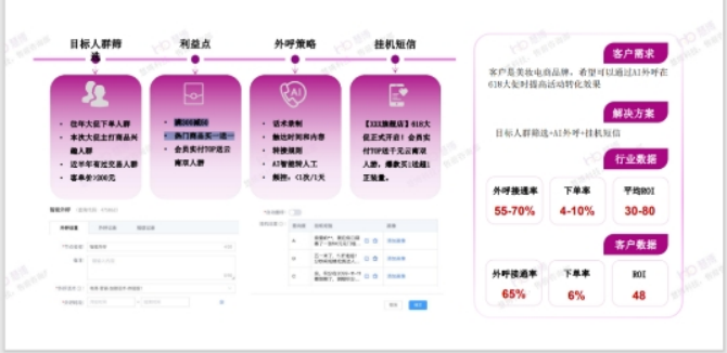 例如,今年618期間,慧博科技某美妝品牌客戶,基于慧博慧博云千載數(shù)據(jù)中臺監(jiān)測到最近上的新品下單的趨勢增強,基于該部分興趣人群的篩選,通過618這個大促契機(jī),以“滿300減50 熱門商品買一送一”等利益點進(jìn)行智能AI外呼觸達(dá)+掛機(jī)短信提醒,下單率提升6%。