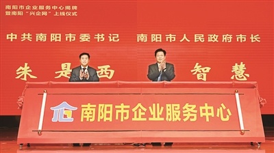 南陽(yáng)市委書(shū)記朱是西(右)、市長(zhǎng)王智慧(左)為南陽(yáng)市企業(yè)服務(wù)中心揭牌