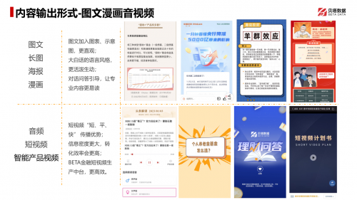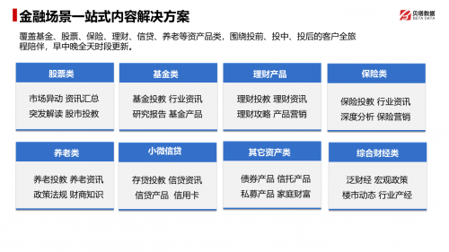 貝塔數(shù)據(jù)針對金融場景提供了一站式的內(nèi)容解決方案,覆蓋基金、股票、保險、理財、信貸、養(yǎng)老等不同資產(chǎn)類別,并以投前、投中、投后的全過程為核心,為金融機構(gòu)提供全面的客戶陪伴服務(wù)。