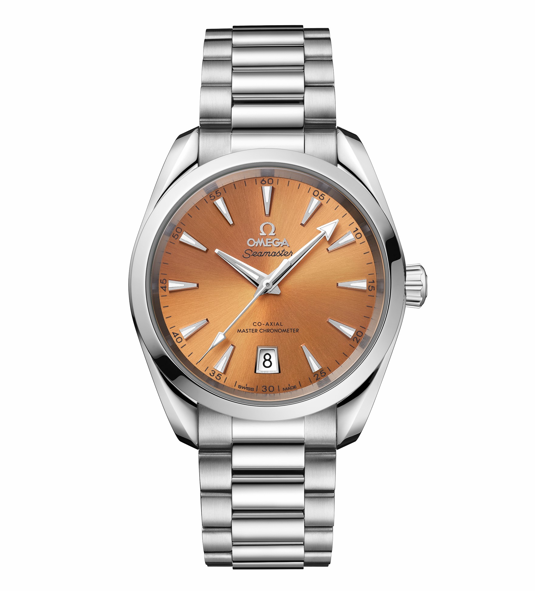 海馬系列 Aqua Terra 150米38毫米至臻天文臺(tái)表采用對(duì)稱設(shè)計(jì),表殼和表冠均以拋光精鋼材質(zhì)打造,表背采用波紋邊緣設(shè)計(jì)。6點(diǎn)位設(shè)有日歷窗,鍍銠指針和小時(shí)刻度均覆有白色 Super-LumiNova 夜光涂層。不銹鋼表鏈采用精美的圓弧形鏈節(jié),經(jīng)拋光和拉絲處理。內(nèi)部搭載歐米茄8800至臻天文臺(tái)機(jī)芯,通過由瑞士聯(lián)邦計(jì)量研究院(METAS)核準(zhǔn)的至臻天文臺(tái)認(rèn)證,其精準(zhǔn)度、防磁性和整體性能均達(dá)到行業(yè)的更高標(biāo)準(zhǔn)。其表盤由黃銅制成,經(jīng)過漆面處理,由中央向四周呈現(xiàn)出太陽射線的打磨效果。各種色彩中,橘黃色古典氣息十足,雅致而沉穩(wěn)。砂巖色樸實(shí)無華,屬于低調(diào)而休閑的實(shí)力派。