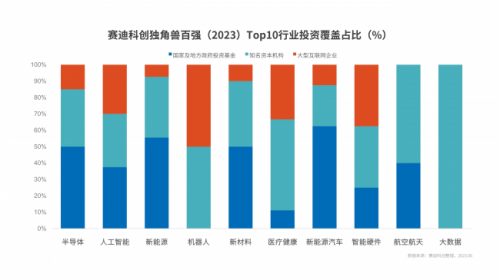 賽迪科創(chuàng)獨(dú)角獸百強(qiáng)(2023)中,獨(dú)角獸企業(yè)與國(guó)家及地方政府基金、知名資本機(jī)構(gòu)、大型互聯(lián)網(wǎng)企業(yè)投資關(guān)聯(lián)度達(dá)到93%,分別投資覆蓋(含重復(fù))了69家、65家、35家獨(dú)角獸百強(qiáng),初步形成“知名資本+大型互聯(lián)網(wǎng)企業(yè)+政府投資”三方格局。其中,新能源汽車、新能源、半導(dǎo)體和新材料行業(yè)政府基金投資覆蓋均超過50%,成為最受關(guān)注的賽道。