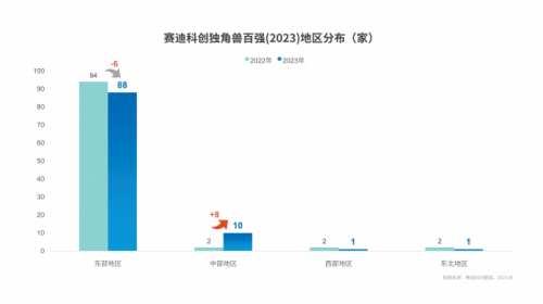 地區(qū)層面,賽迪科創(chuàng)獨(dú)角獸百強(qiáng)(2023)分布不平衡態(tài)勢(shì)依然突出,東部地區(qū)占88家,中部地區(qū)占10家、西部地區(qū)占1家,東北地區(qū)占1家,與上一年相比,中部地區(qū)增長(zhǎng)最多,增加8家,東部地區(qū)則有所降低,但仍處于絕對(duì)領(lǐng)先地位。