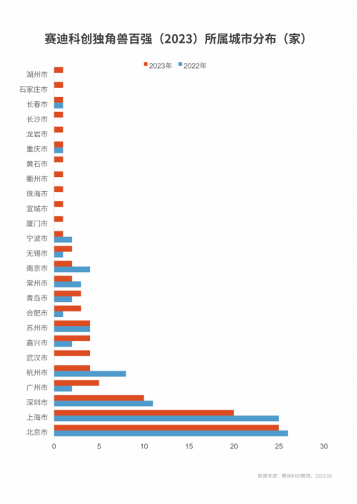 (二)城市格局:三強(qiáng)格局基本穩(wěn)固,兩家以上獨(dú)角獸百強(qiáng)城市再度擴(kuò)容
