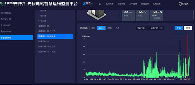 在整個(gè)臺(tái)風(fēng)過(guò)程中,匯耀品尚能源科技光伏電站智慧運(yùn)維監(jiān)測(cè)平臺(tái)起到了重要作用,對(duì)環(huán)境風(fēng)速變化、系統(tǒng)監(jiān)測(cè)狀態(tài),及時(shí)提供了實(shí)時(shí)數(shù)據(jù)。